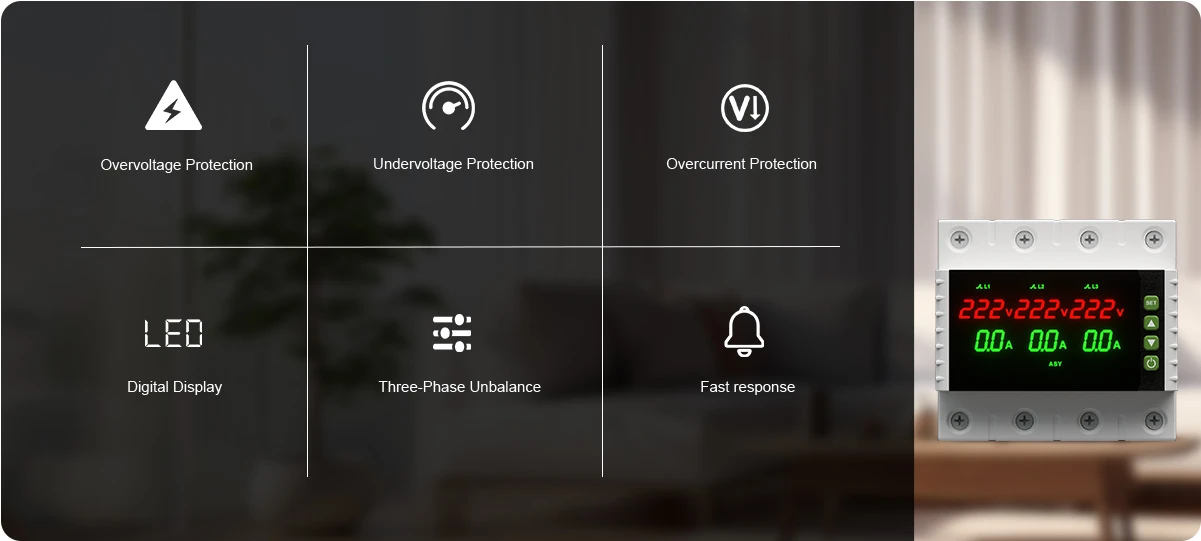 • Protect electrical device against over/ under voltageover current, three phase asymmetry and incorrect phase sequence